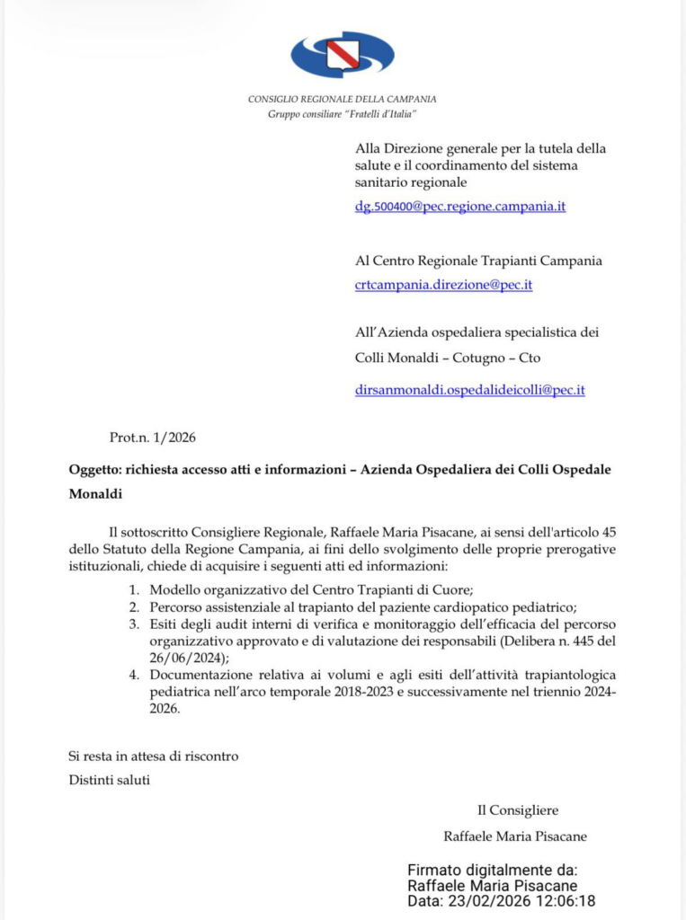 Napoli “Non resteremo a guardare. Il servizio andato in onda ieri sera su Le Iene ha raccontato quella che, fino a qualche anno fa, veniva indicata come una realtà di eccellenza della trapiantologia pediatrica presso l’Ospedale Monaldi. Proprio per questo ho ritenuto doveroso attivarmi immediatamente, chiedendo formalmente l’accesso agli atti per verificare la veridicità dei numeri, dei dati e dell’organizzazione del Centro Trapianti. La trasparenza viene prima di tutto. Solo dopo un’analisi puntuale e documentale proseguiremo con interrogazioni e chiederemo eventuali provvedimenti conseguenti. Sulla salute dei bambini non si fa propaganda: si fa chiarezza.” Ecco quanto riferisce Raffaele Maria Pisacane, consigliere regionale della Campania in quota Fratelli d’Italia, a margine della messa in onda di un servizio della trasmissione de Le Iene su Italia 1 sul caso del trapianto fallito all’Ospedale Monaldi di Napoli che ha determinato la prematura scomparsa di Domenico, bimbo di Nola che ha subito il fallimento del trapianto di cuore.
