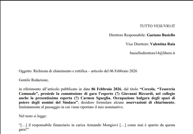 Cercola (Na) – Ieri mattina, 12 febbraio 2026, è pervenuta sulla mail di TuttoVesuvio direttorebusiello14@libero, inviata a mezzo PEC dal funzionario finanziario provvisoriamente in servizio al comune di Cercola Armando Mongiovì, una curiosa e inaccoglibile richiesta formale di chiarimento e rettifica rispetto alla pubblicazione di un’articolo del 5 febbraio 2026 dal titolo: “Cercola. ‘Tesoreria Comunale’, presiede la commissione di gara l’esperto (?) Giovanni Riccardi, nel collegio anche la presentissima esperta (?) Carmen Sgueglia. Occupazione bulgara degli spazi di potere degli uomini del Sindaco”. Ovviamente, una richiesta non accoglibile in quanto la nostra attività giornalistica mira a confezionare una narrazione reale delle dinamiche amministrative locali, nonostante un violento e continuo attacco giudiziario determinato dalle decine e decine di querele ricevute (tutte andate a buon fine per Tuttovesuvio n.d.r.) ribadiamo convintamente le critiche contenute nell’articolo sotto osservazione da Mongiovì e rilanciamo l’interrogativo: perchè Armando Mongiovì non è stato nominato presidente della commissione di gara per l’affidamento del servizio quinquennale della Tesoreria comunale, possedendo l’esperienza e competenze tecniche necessarie per l’incarico rispetto ai ‘novellini’ funzionari Riccardi e Sgueglia? Resta davvero curiosa questa posizione di Mongiovì rispetto alla diffusione pubblica dell’informazione relativamente al fatto che lo stesso detiene le competenze necessarie affinchè possa presiedere con efficacia il ruolo di presidente di una commissione che si pronuncia su un tema tecnico e complesso quale la Tesoreria Comunale, La nomina dei componenti della commissione di gara sono state effettuate da Nicola Boccia, funzionario del servizio ambiente e pubblica istruzione: perchè?