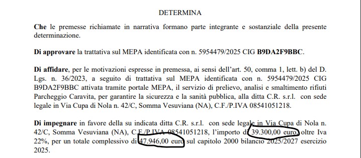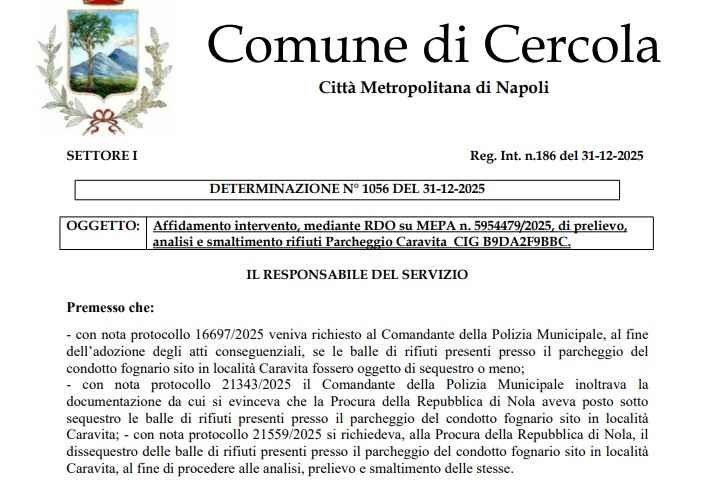 Cercola (Na) – Il comune di Cercola ha speso 47,946€ dei contribuenti al fine di smaltire 8 balle di rifiuti abbandonate nel parcheggio comunale della Cittadella Sportiva di Caravita: ecco quanto dispone la determina dirigenziale n. 1056 del 31 dicembre 2025 approvata da Nicola Boccia, funzionario all’ecologia dell’ente di Piazza della Libertà. Il provvedimento amministrativo che ha previsto analisi (?) prelievo (?) e smaltimento dei rifiuti in questione pone delle importanti, a tratti inquietanti, riflessioni rispetto alla spesa inferta alle casse comunali di 47.946€: costo del servizio relativo all’intervento di sanificazione ambientale affidato direttamente alla C.R. di Somma Vesuviana, impresa proveniente dallo stesso comune dove il funzionario è dipendente risulta essere di ruolo in quel Municipio.