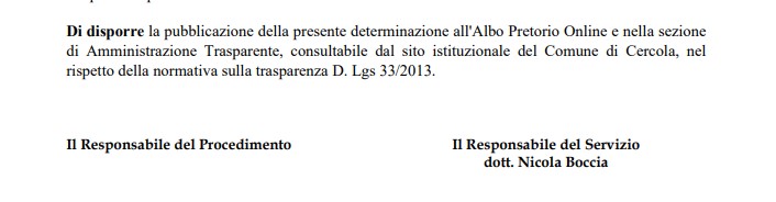 La determina dirigenziale approvata da Nicola Boccia presenta anche dei tratti sibillini, non consoni a un provvedimento amministrativo, che non fanno comprendere chi e quando ha richiesto al Comune di Cercola la rimozione dei rifiuti , e se a seguito di istruttoria del Comandante della Polizia Municipale Vincenzo Montella, relativamente alla richiesta inoltrata in Procura della Repubblica del dissequestro, sia stato effettivamente disposto dall’autorità nolana.