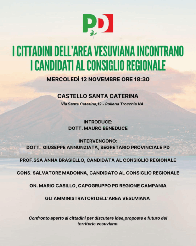 Pollena Trocchia (Na) – “I cittadini dell’area vesuviana incontrano i candidati al consiglio regionale”: mercoledì 12 novembre 2025, dalle ore 18.30, nello splendido scenario del Castello Santa Caterina, ci sarà questo importante appuntamento elettorale del Partito Democratico a sostegno dei candidati al consiglio reginale della Campania Salvatore Madonna, già consigliere comunale di Napoli e consigliere metropolitano partenopeo, e Anna Brasiello, assessore alla pubblica istruzione del comune di Pollena Trocchia. Le elezioni regionali si celebreranno i prossimi 23 e 24 novembre 2025.