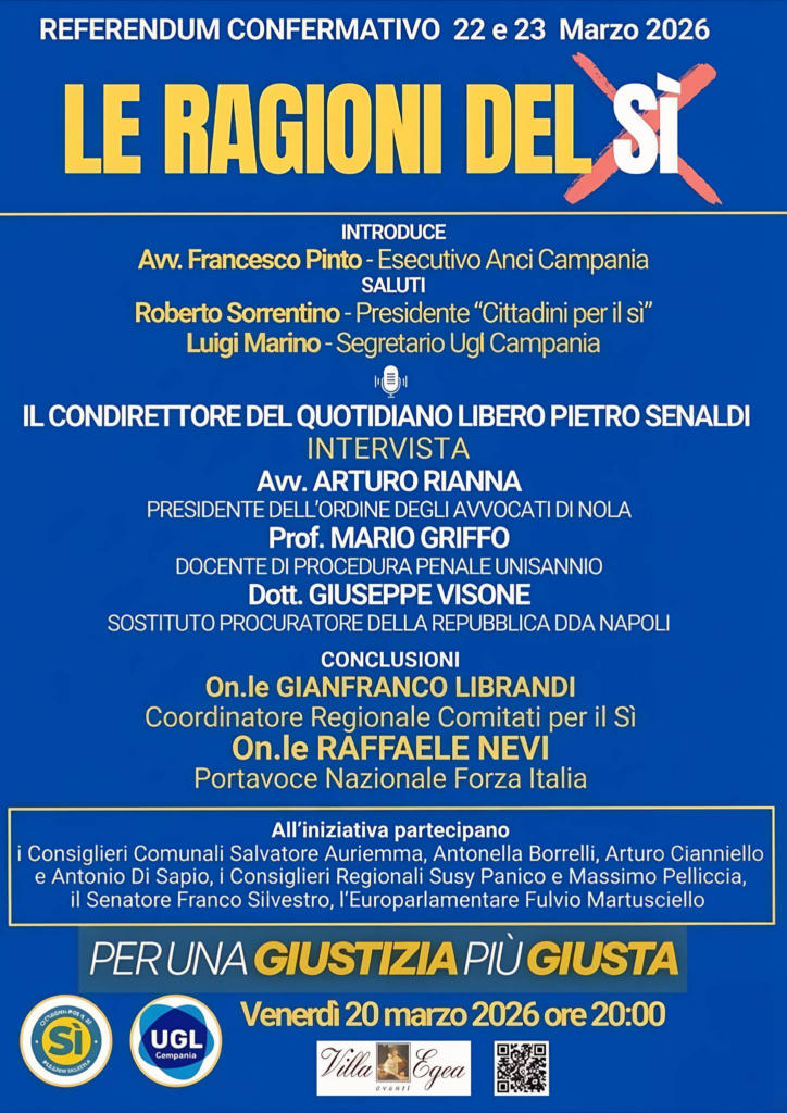 Massa di Somma (Na) – La campagna refendaria della Giustizia per il SI sotto al Vesuvio si chiude a Massa di Somma il prossimo venerdì 20 marzo: si terrà dalle ore 19,30 a Villa ERgea un evento di approfondimento sul referendum che vedrà la partecipazione di illustri rappresentanti della società accademica, politica, giuridica e civile dove svettano la partecipazione anche di Pietro Senaldi, direttore del quotidiano Libero, e il sostituto procuratore della Direzione Distrettuale Anyimafia di Napoli Giuseppe Visone.
