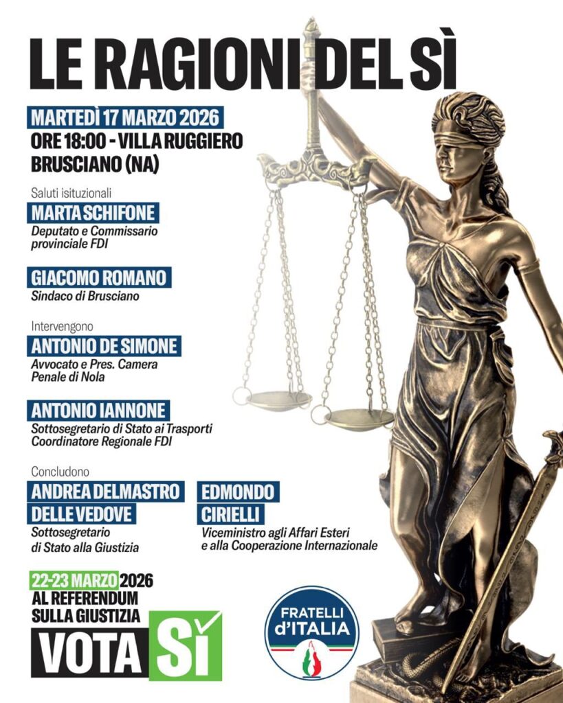 Brusciano (Na) – Grande attesa per la convention referendaria “Le Ragioni del Si” in agenda dalle ore 18,00 di martedì 17 marzo nello splendido scenario di Villa Ruggiero accoglierà i tre uomini di rilievo del Governo : il viceministro degli esteri Edmondo Cirielli, il sottosegretario al Ministero della Giustizia Andrea Del Mastro Delle Vedove e il sottosegretario al Ministero dei Trasporti Antonio Iannone.